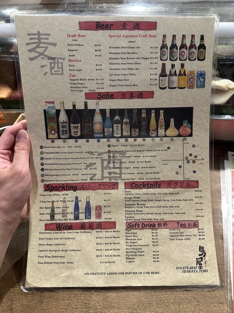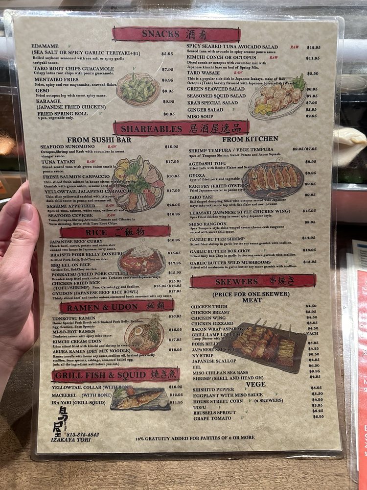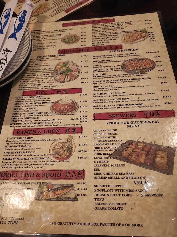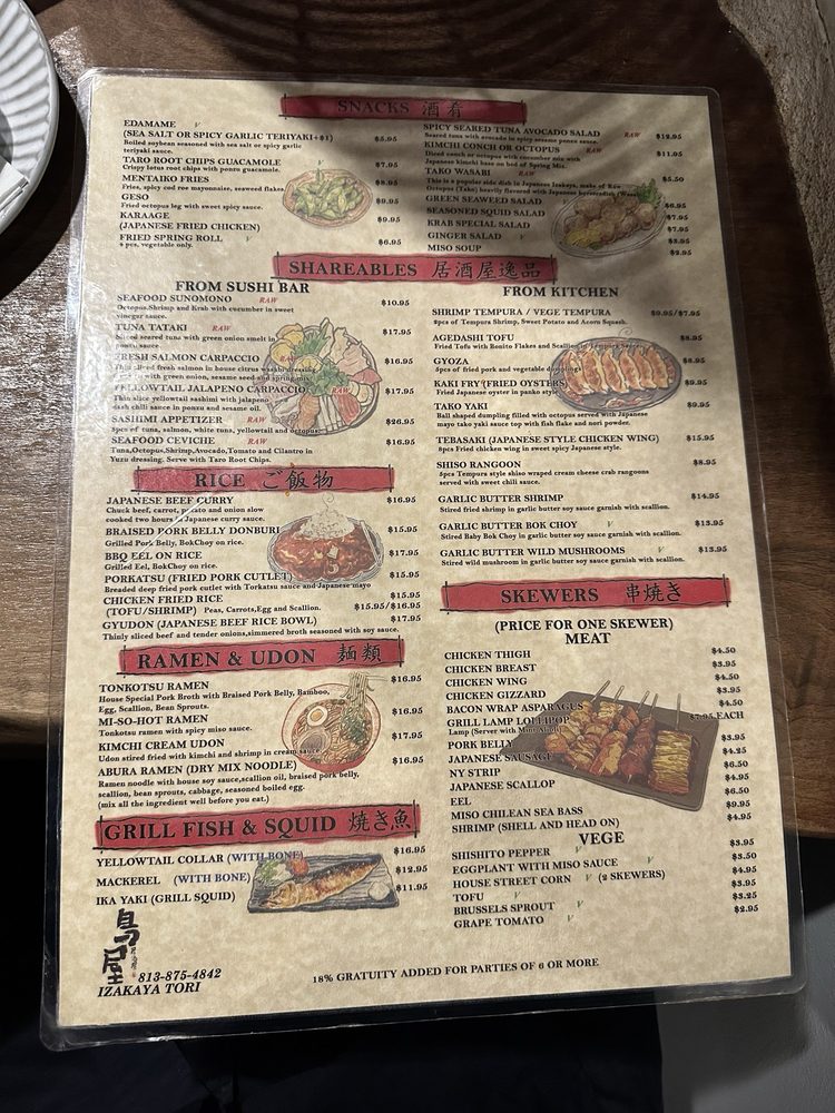 Introducing the menu at Izakaya Tori, located in Tampa, FL, offers a diverse range of Asian-inspired dishes with soy-free, vegan, and many vegetarian options. This trendy and intimate spot provides a casual yet vibrant atmosphere, perfect for lunch or dinner. Customers praise the fresh and flavorful sushi, the tasty gyoza and takoyaki, and the delicious ramen, including the creamy and spicy MiSo Hot Ramen. The extensive menu includes favorites like Chicken Karaage, NY Strip, Eel, and Pork Belly. With an attentive staff, fast-paced service, and a cozy ambience, Izakaya Tori stands out as one of the best sushi bars in Tampa. Don't miss out on their happy hour specials and outdoor seating options.